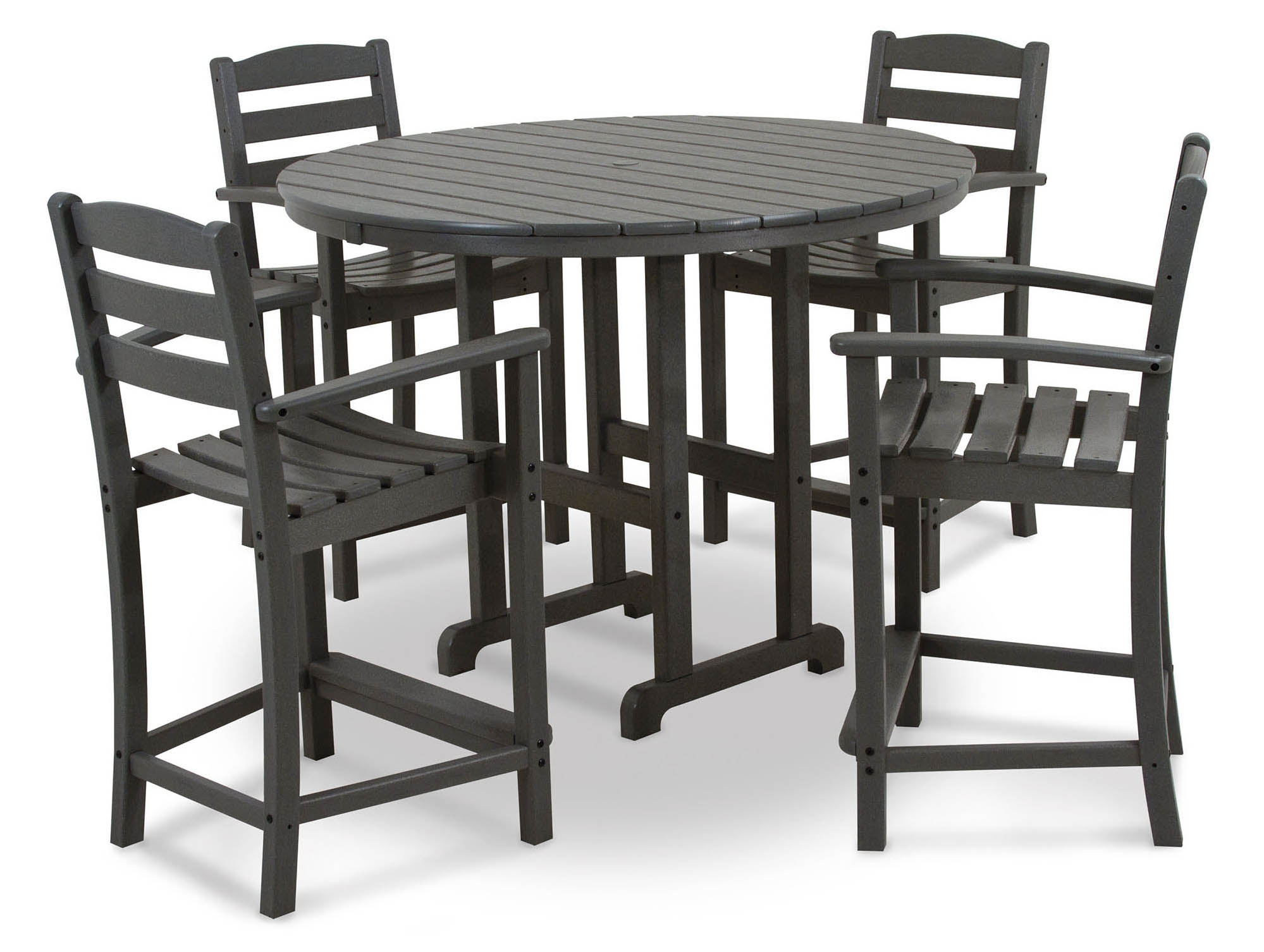 Whether you are looking for an outdoor dining set for your home or enough to furnish an entire restaurant, the POLYWOOD La Casa Cafe 5 Piece Counter Set is an perfect choice. This raised dining set is made out of plastic lumber that stands up to all the elements. Choose from the available color options when ordering this set in order to customize it to suit your decor.